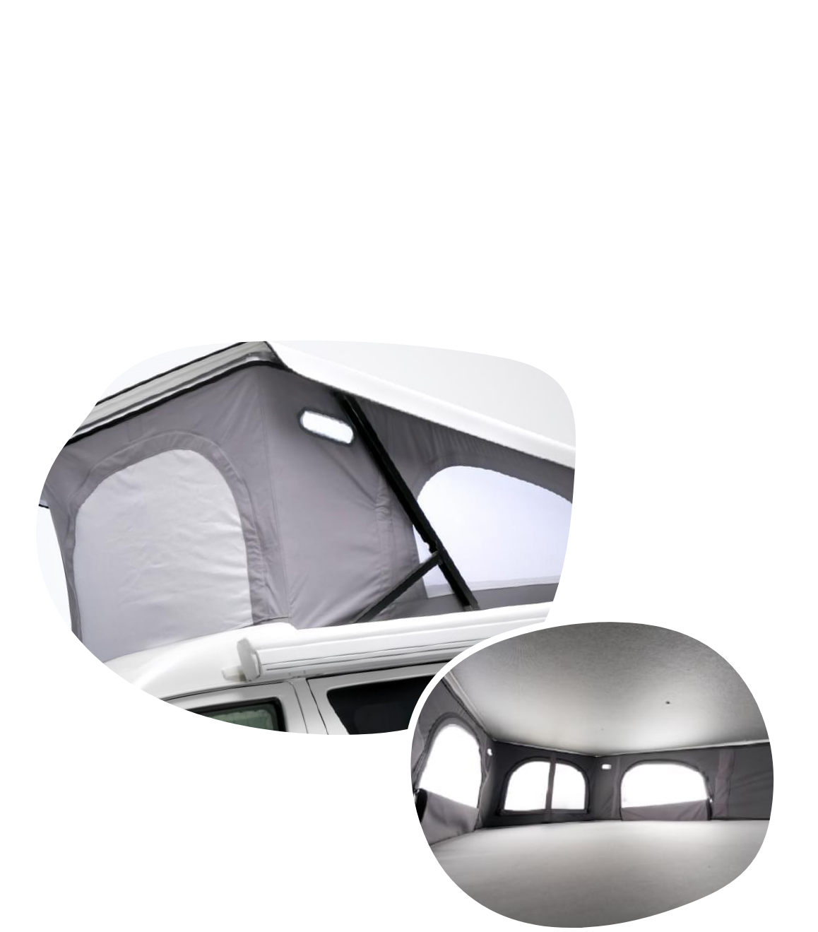 天井が上に開くことで車内スペースが広がり、大人がゆったりと就寝できる空間を確保。さらに、一般的なルーフテントとは異なり、車外に出ることなく車内で移動できる利便性は、多くのお客様にとって大きな魅力となっています。